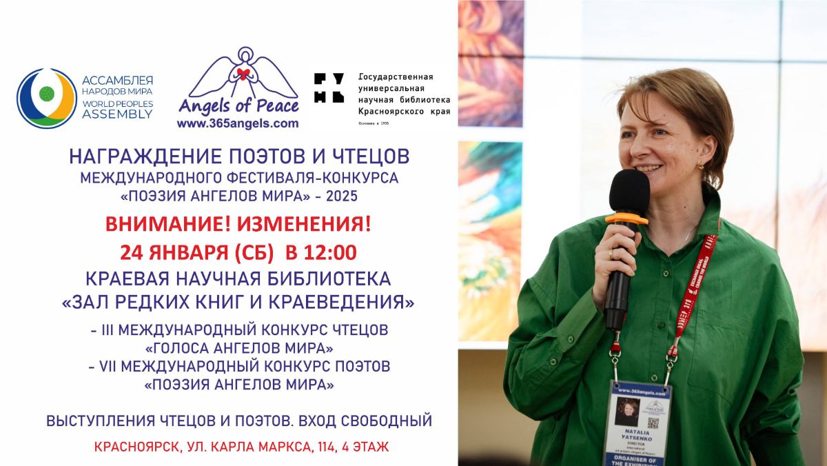 - Все участиники и члены их семей, группы поддержки приглашаются на итоговое праздничное мероприятие Фестиваля-конкурса «Поэзия Ангелов Мира», которое пройдет 11 ноября 2023 года с 15-30. Место проведения: г. Красноярск, пр. Металлургов, 22. Дворец труда и согласия.