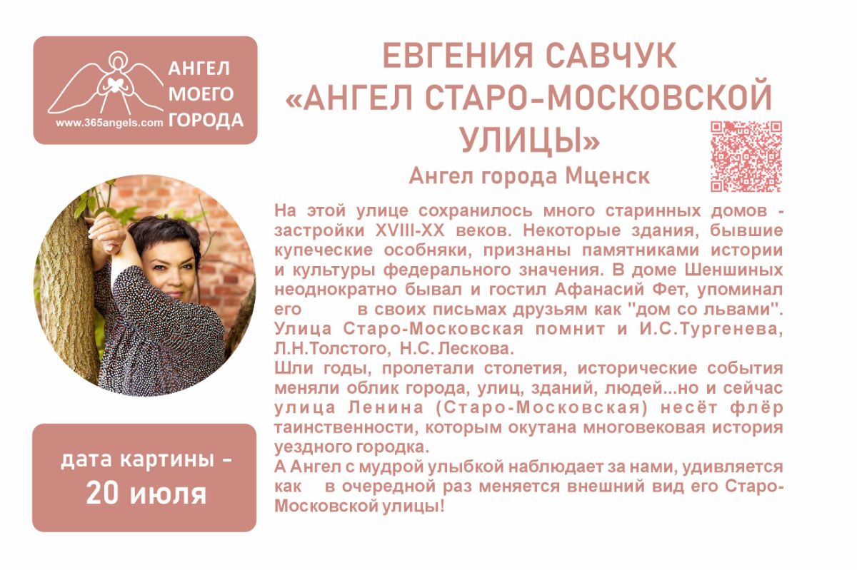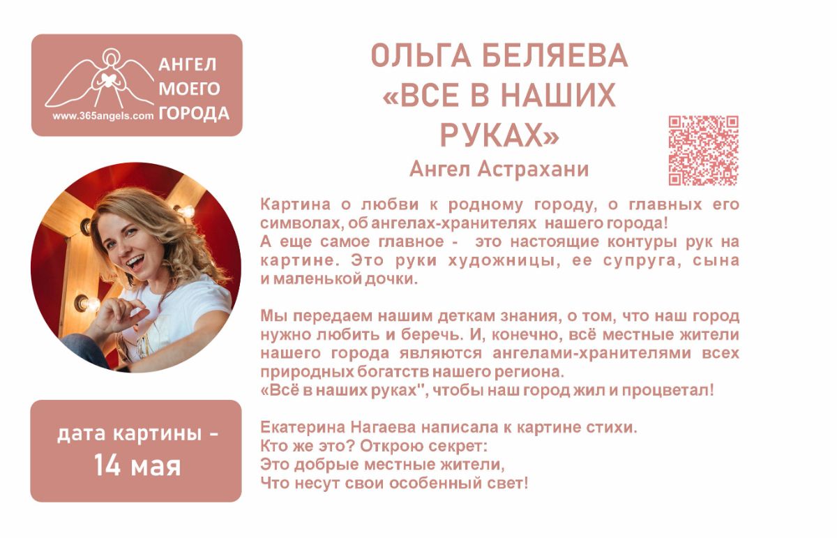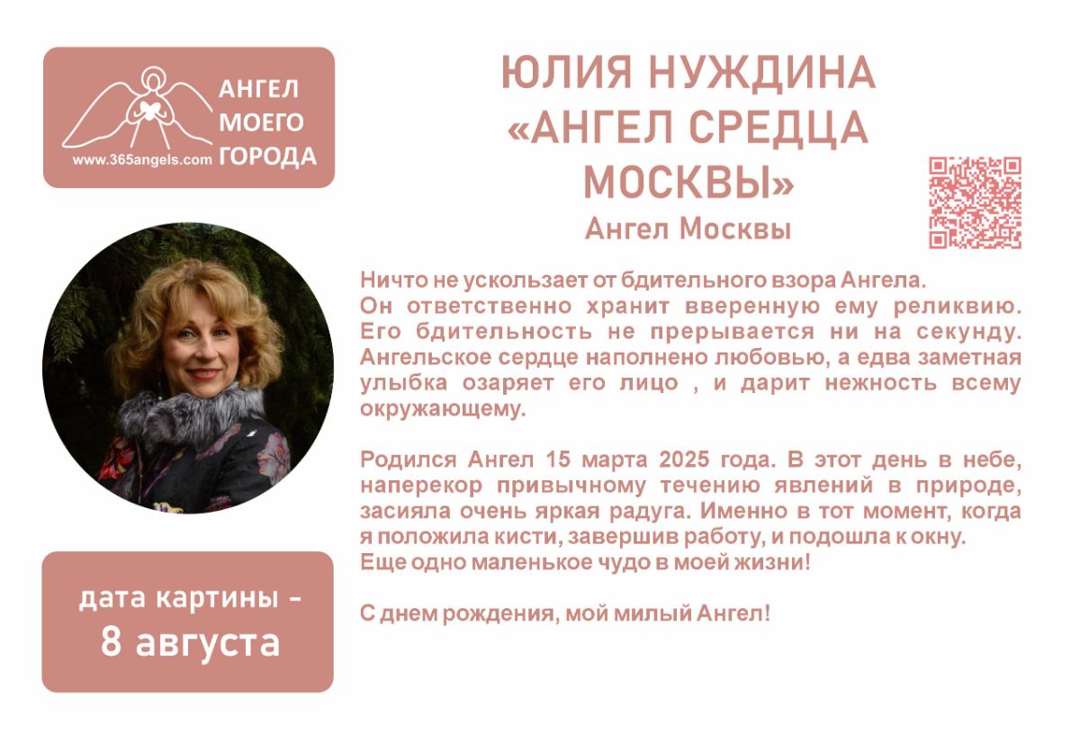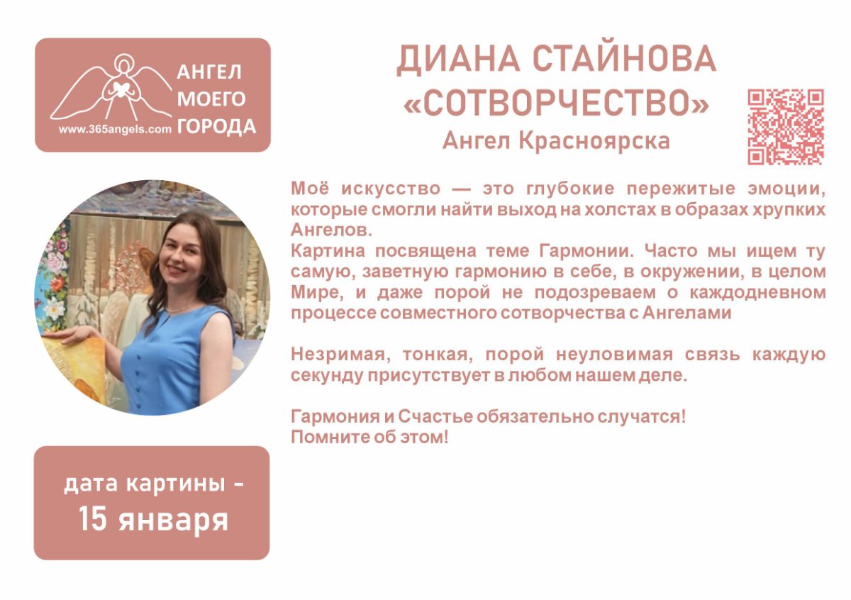 По просьбе художников, участвующих и желающих участвовать в арт-проекте «Ангелы Мира», и в связи с тем, что ситуация в мире «кричит» о том, что помощь Ангелов, помощь Света нам всем очень нужна, принято решение начать реализацию нового выставочного проекта – «Ангел моего города». Мы решили объединить художников из разных городов и стран для проведения передвижных выставок картин на тему «Ангел моего города».