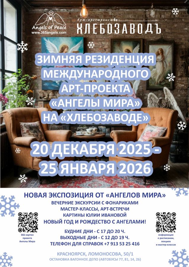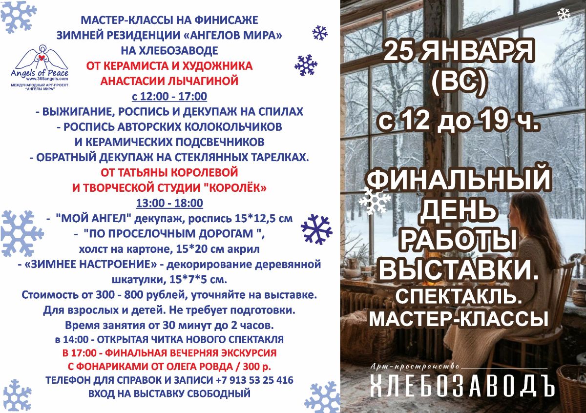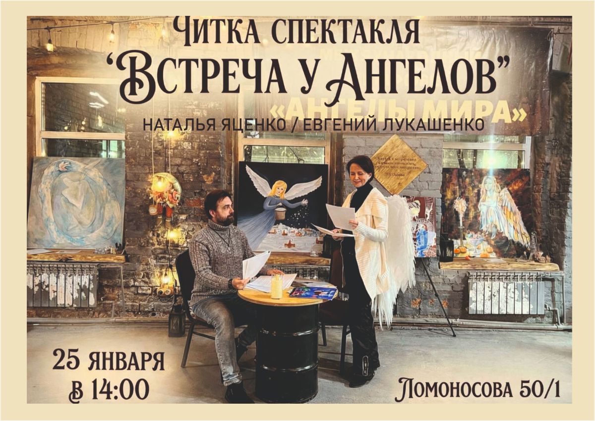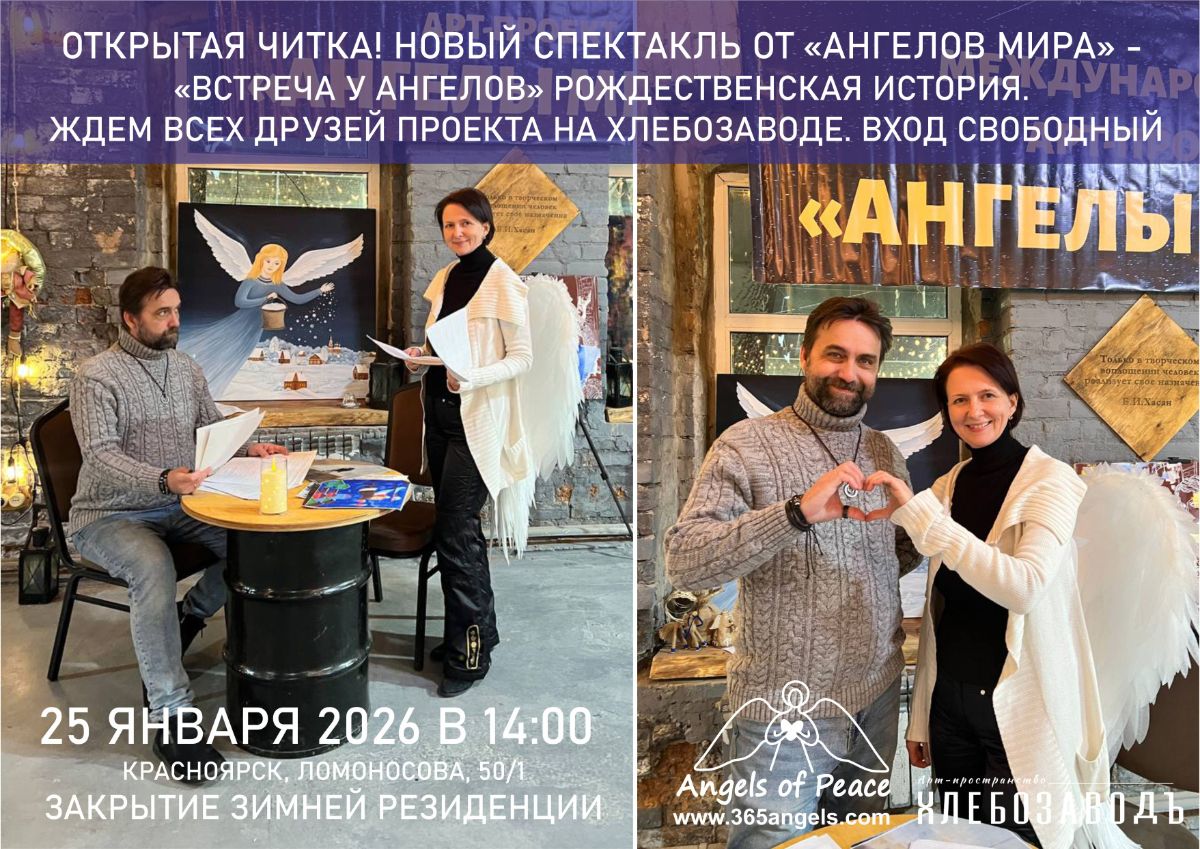 25 ЯНВАРЯ В 14:00 ФИНИСАЖ - ЗАКРЫТИЕ ЗИМНЕЙ РЕЗИДЕНЦИИ. ОТКРЫТАЯ АРТ-ЧИТКА НОВОГО СПЕКТАКЛЯ "ВСТРЕЧА У АНГЕЛОВ" РОЖДЕСТВЕНСКАЯ ИСТОРИЯ. СО СТИХАМИ И ИСТОРИЯМИ "АНГЕЛОВ МИРА". ВХОД СВОБОДНЫЙ.