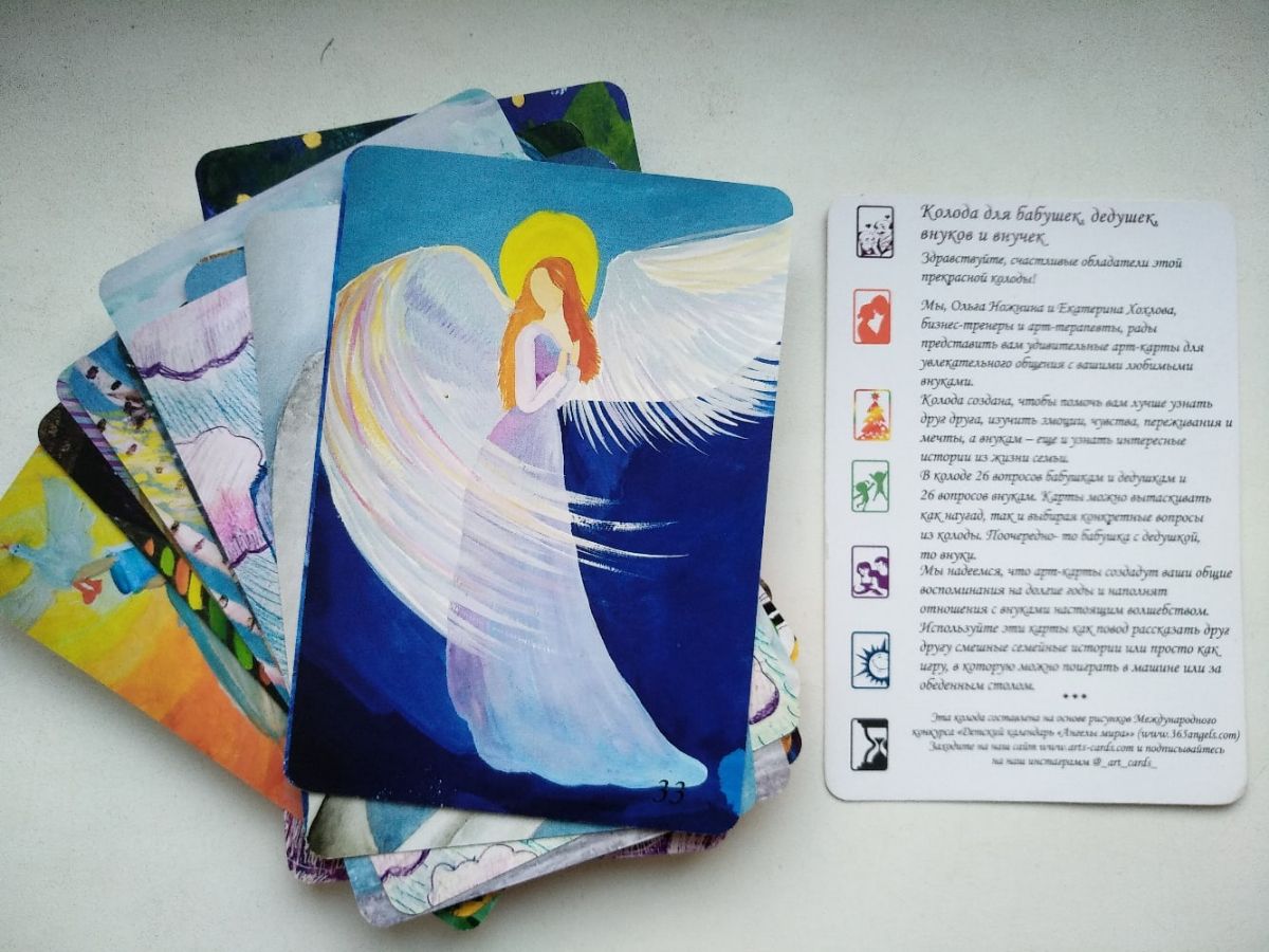 Благодаря сотрудничеству с Ольгой Ножниной (Кипр) и Екатериной Хохловой (Москва) на свет появилась новая колода арт-карт с рисунками нашего Международного конкурса "Детский календарь "Ангелы Мира". До этого были выпущены арт-карты с картинами проекта "Ангелы Мира" и работами художницы Юлии Ивановой.