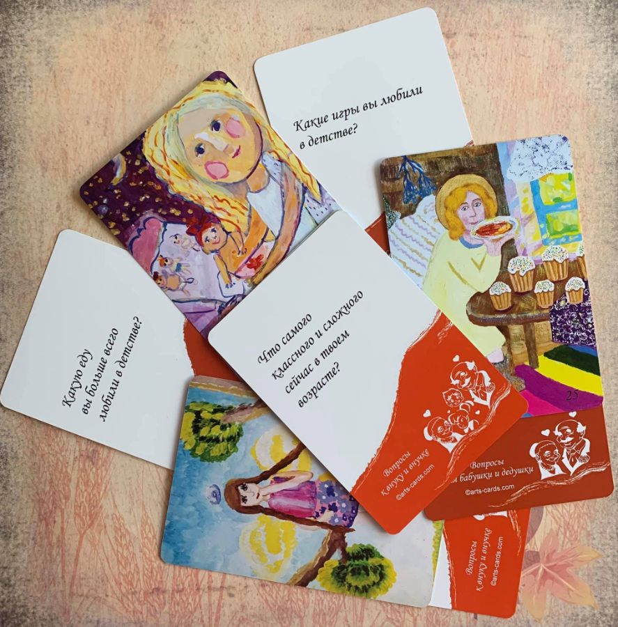 26 карт с вопросами для бабушек и дедушек и 26 - с вопросами внукам. Карты можно вытаскивать как наугад, так и выбирая конкретные вопросы из колоды. Используйте эти карты как повод рассказать друг другу смешные семейные истории или просто как игру, в которую можно поиграть в машине или за обеденным столом.