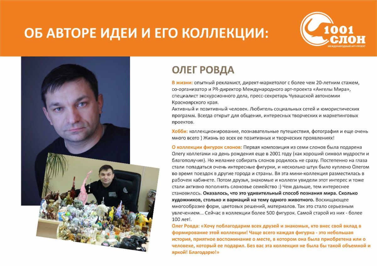 Сегодня 22 сентября Всемирный день защиты слонов. В этот день мы хотим рассказать об еще одном международном арт-проекте для художников. В его основу легла коллекция фигурок слонов Олега Ровда. С помощью друзей она уже более 20 лет пополняется новыми работами из разных стран и континентов. Коллекция выставлялась в музеях и галереях, но всегда хотелось наполнить выставочное пространство картинами, сделать экспозицию более целостной.