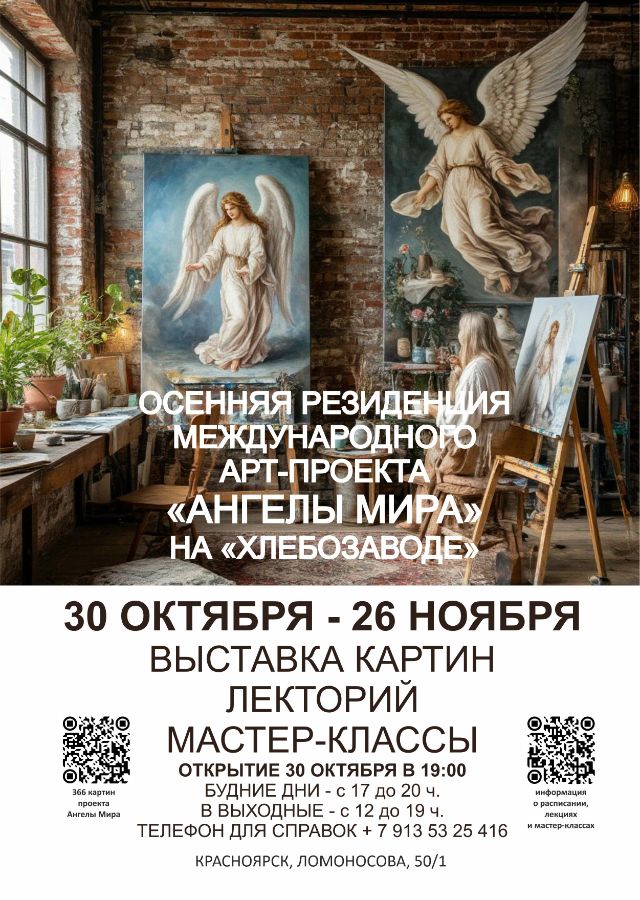 Друзья, благотворительная инициатива Арт-пространства "Хлебозаводъ" и Международного арт-проекта "Ангелы Мира" дарит возможность красноярцам и гостям города увидеть выставку бесплатно целый месяц. А еще будут лекции, мастер-классы, вечерние экскурсии с фонариками.