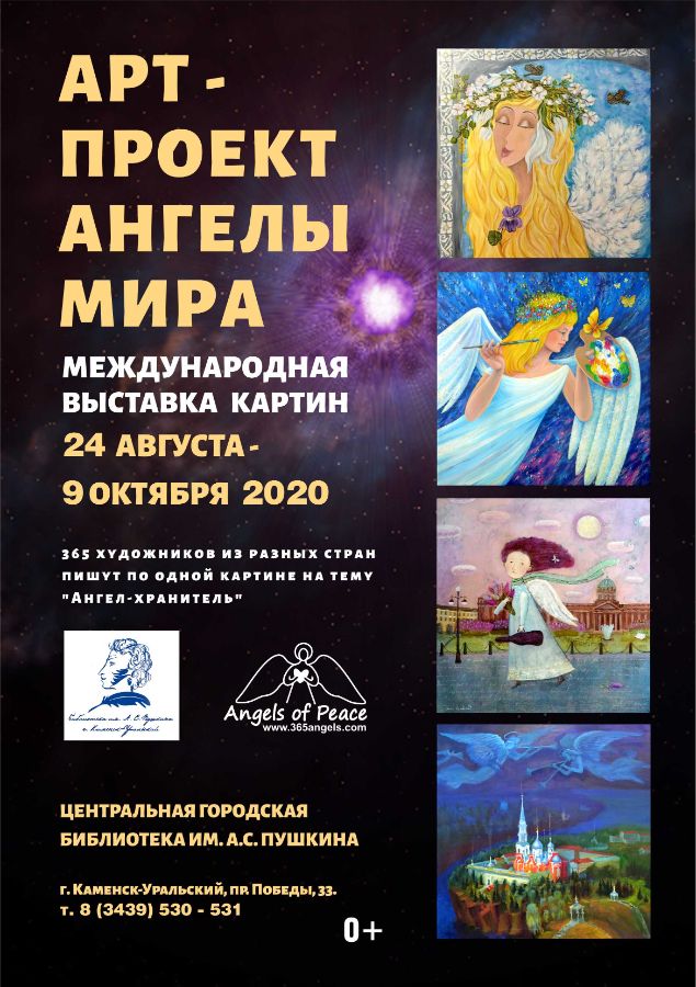 24 августа в 14-00 в библиотеке им. А. С. Пушкина города Каменска-Уральского открывается выставка живописных полотен из коллекции Международного арт-проекта «Ангелы мира». Каменцы увидят более 25 работ художников из России, Великобритании, Республики Сербской, Беларуси, Турции на тему «Ангел-Хранитель».