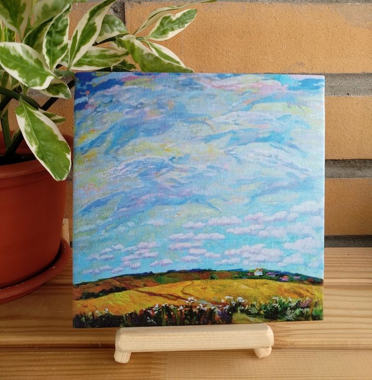 Холст поставить на мини-мольберт или вставить в рамку формата 15*15 см. Картина будет долго радовать Вас, передавая все тепло, которое вложил в нее автор.