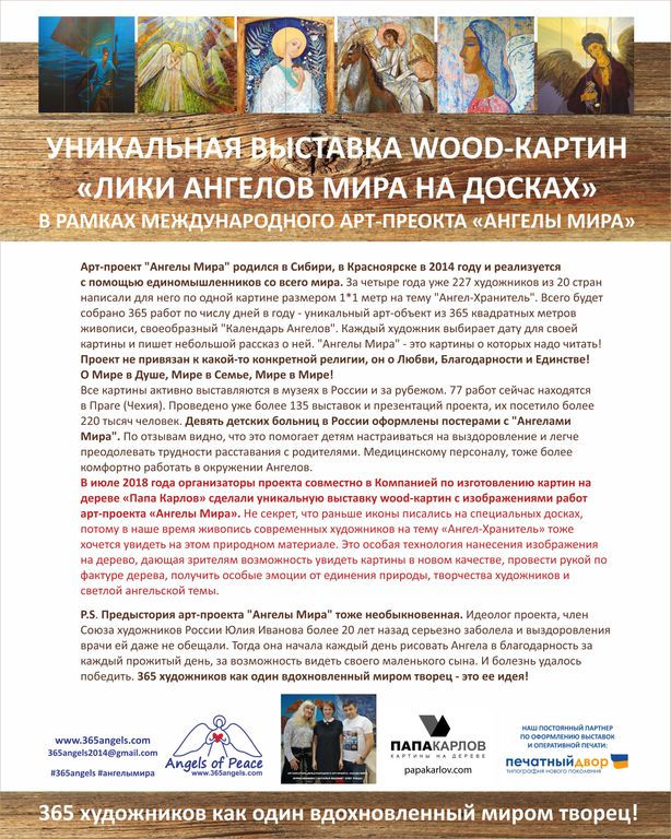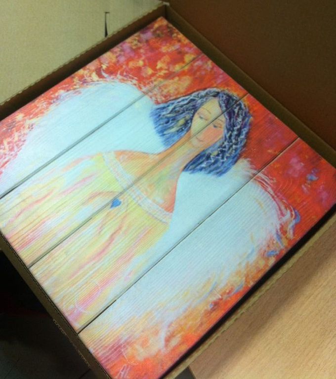 Не секрет, что раньше иконы писались на специальных досках, потому в наше время живопись современных художников на тему «Ангел-Хранитель» тоже хочется видеть на этом природном материале. Это особая технология нанесения изображения на дерево, дающая зрителям возможность увидеть картины в новом качестве, провести рукой по фактуре дерева, получить особые эмоции от единения природы, творчества и светлой ангельской темы.